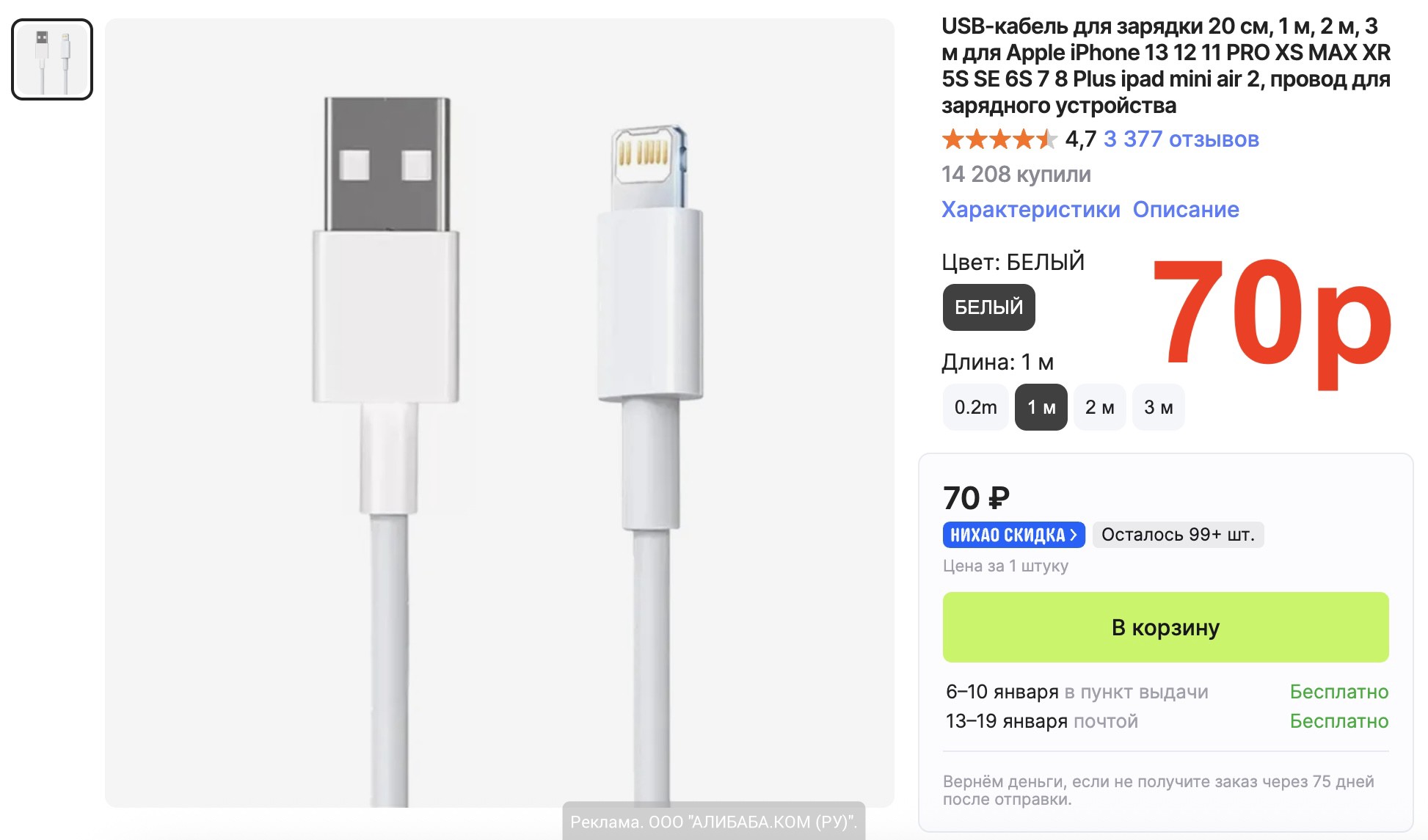 🔥 USB-Lighting кабель для зарядки для Apple iPhone за 69р