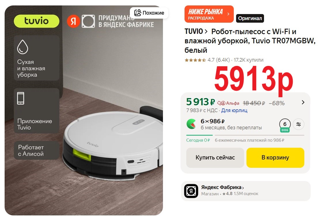• Яндекс Маркет - робот-пылесос Tuvio TR07MGBW за 5913р: