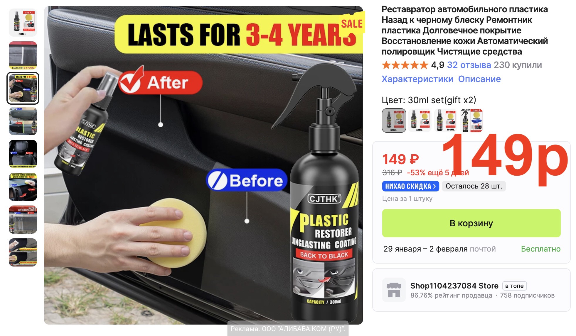 🔥 Реставратор автомобильного пластика за 149р (30 мл + 2 губки)
