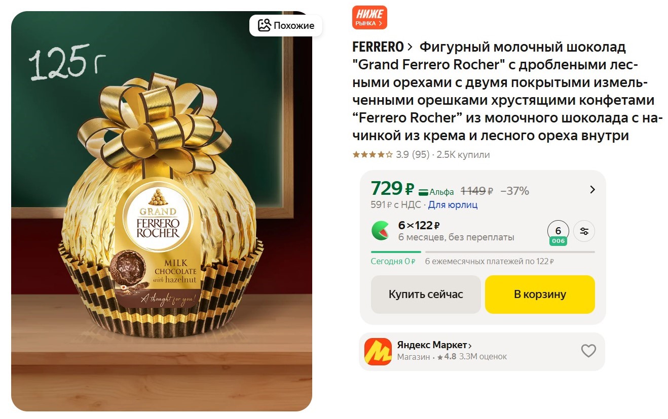 • Фигурный молочный шоколад "Grand Ferrero Rocher" за 729₽. Большая подарочная упаковка 125 г.