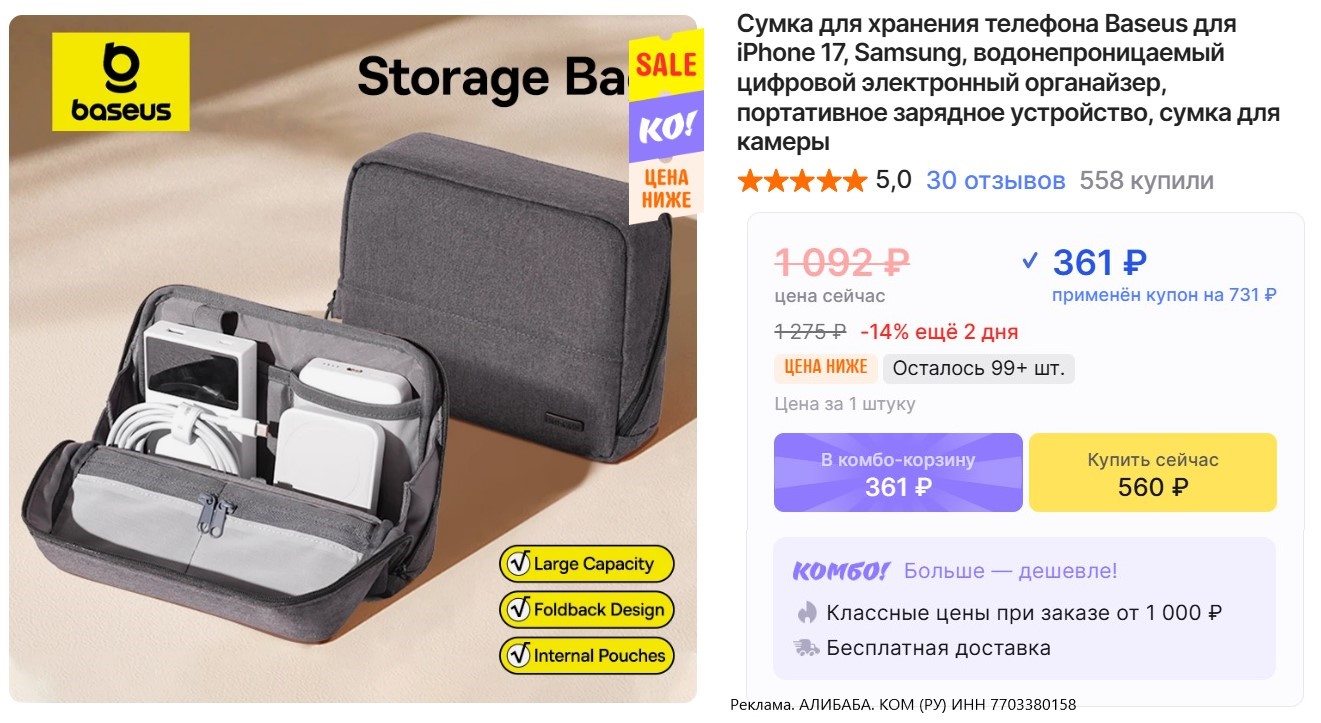 • Топ-цена! Сумка для хранения от бренда Baseus за 361₽ c купоном при покупке через комбо-корзину. Везде в 2-3 раза дороже. Размеры 20×6×15 см, внутри вместительное основное отделение и несколько карманов.