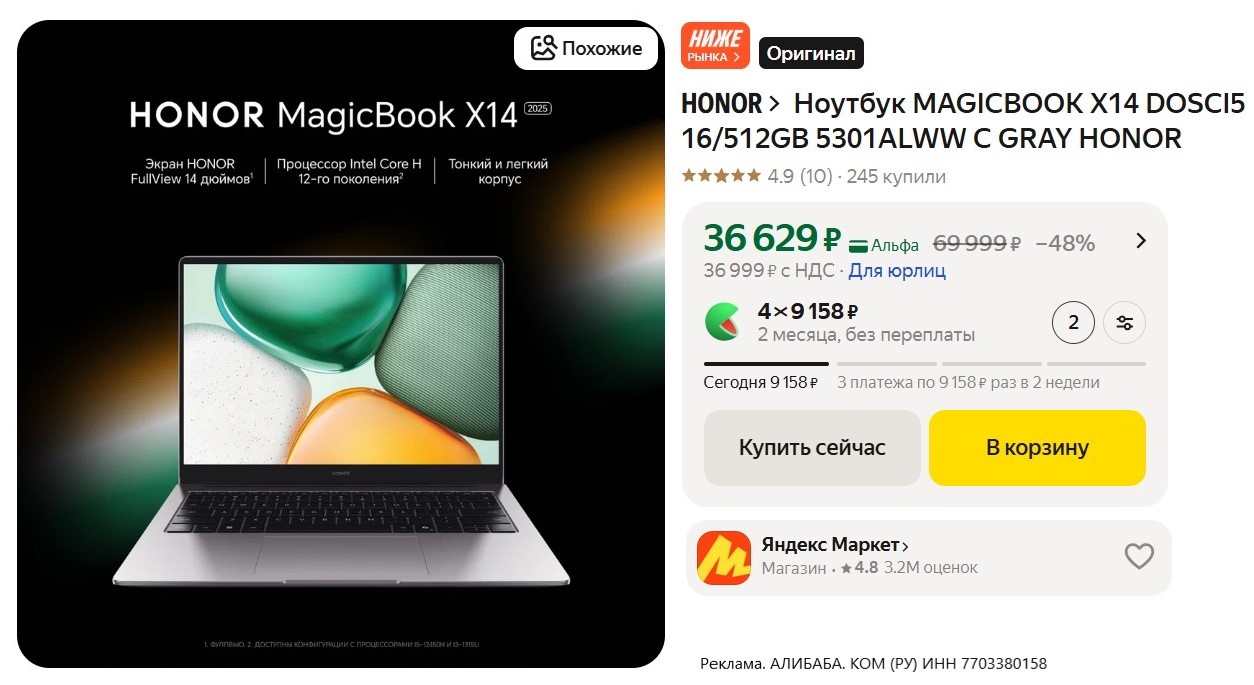 • Ноутбук HONOR MAGICBOOK с кодом: