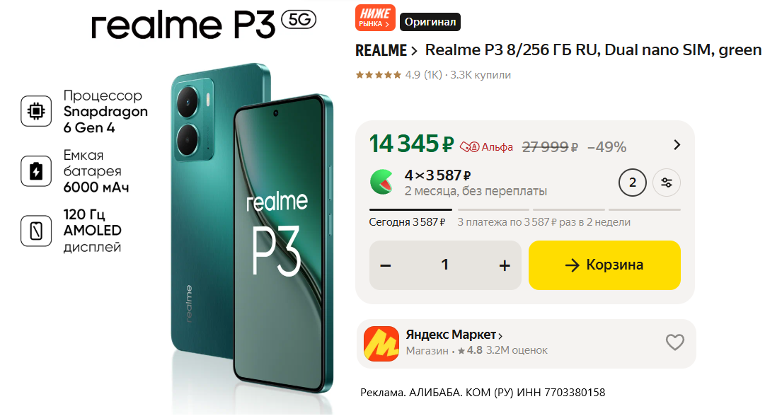 • Смартфон realme P3 5G 8/256 ГБ с кодом: FAST100-AF за 14246₽. Ещё есть в сером цвете. AMOLED-экран 6.67", процессор Snapdragon 6 Gen 4, защита IP66/68/69, аккумулятор 6000 мА.