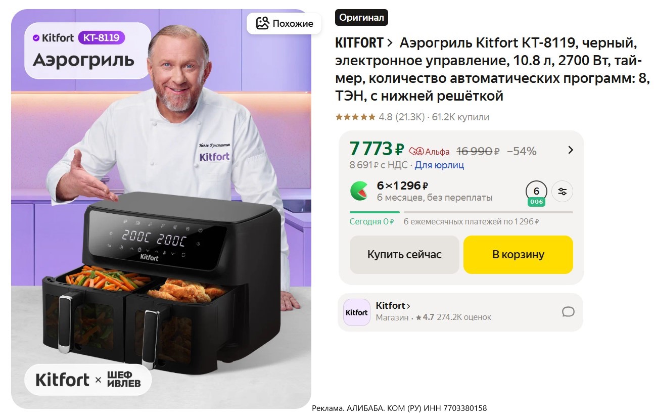 • Аэрогриль Kitfort КТ-8119 с кодом: FAST100-AF за 7682₽. Мощность 2700 Вт, готовит сочные и хрустящие блюда без масла, вместительная чаша на 10,8 л, синхронизация приготовления и возможность сушки овощей.