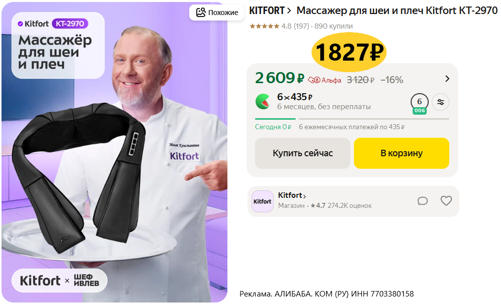 KITFORT30 1827₽. Имеет 3 скорости, режим инфракрасного нагрева, поможет избавиться от дискомфорта в шейно-плечевом отделе, пояснице и других областях.