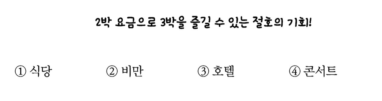 정답: 3번 - 호텔 (ключевое слово в задании 2박, 3박)