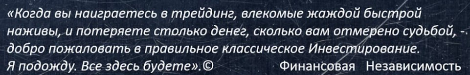 ⚠️Причем я решил начать обучать правильному инвестированию только после того, как сам достиг очевидных хороших результатов в этой области. После того, как сам прочел десятки правильных, нужных и важных книг. После того, как убедился, что ничего подобно по теме инвестиций в ютубе и телеграме просто нет. К тому же мне было очевидно, что народ обманывают, впаривают чушь, правильному инвестированию не учат, а продвигают трейдинг, теханализ и прочую глупость.