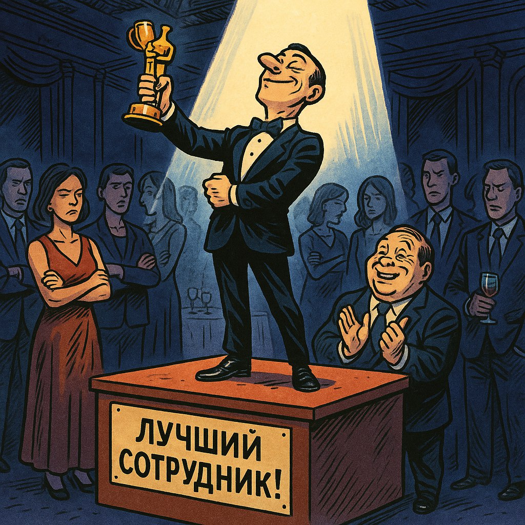 Что получает сотрудник, которого признали лучшим? Все! Дофамин зашкаливает. Самооценка улетает в экзосферу. Он чувствует себя героем, нужным, важным, самым-самым! Его по достоинству оценило руководство. Публично, в торжественной обстановке. Еще и подарок вручили. Нет, он скромный, не зазнается. Но видно: очень ему хорошо и приятно.