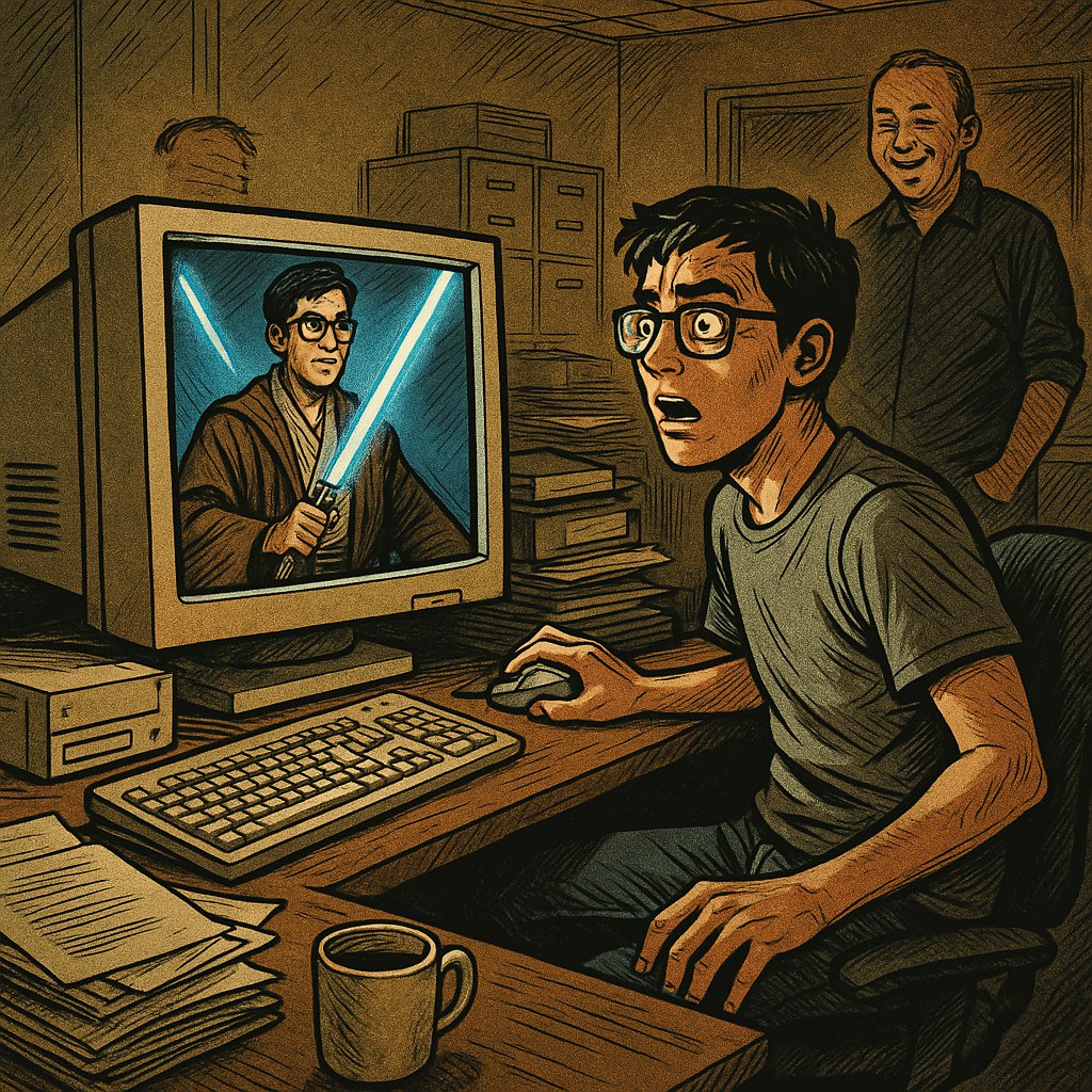 Однажды прихожу в понедельник в офис, включаю комп и офигеваю: вместо Оби-Вана на экране я. В джедайской одежде, лицо напряженное.