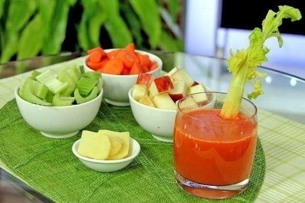 Необходимо две морковки, пару яблок и до пяти стеблей сельдерея измельчить с помощью блендера до получения однородной массы, добавить одну столовую ложку лимонного сока, несколько чайных ложек меда светлых сортов, по половине чайной ложке корицы и имбиря.