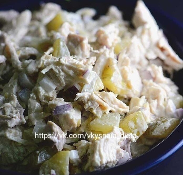 САЛАТ С КУРИЦЕЙ, ГРИБАМИ И СОЛЕНЫМИ ОГУРЦАМИ