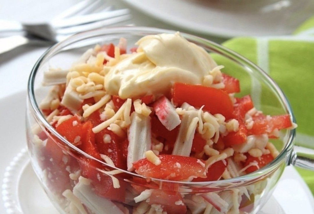 Крабовые палочки и перец порезать соломкой. Помидор порезать на дольки, вынуть семена и жидкость и тоже порезать соломкой. Сыр и чеснок натереть на мелкой тёрке. Все перемешать, посолить по вкусу. По желанию можно добавить зелень.