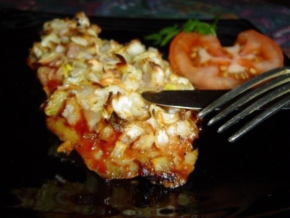 Добавляем специи по вкусу, выкладываем на противень фарш, формируя основу.