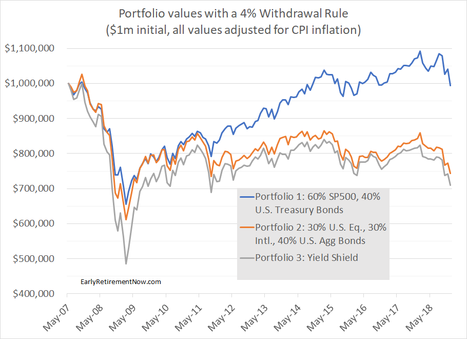 Портфель №2 снизился примерно на 25%, а портфель №3 «Дивидендный щит» снизился почти на 30% к 2018 году. Очевидно, что портфель «Дивидендный щит» не устраняет риск последовательности и даже не уменьшает его. Портфель с высокими дивидендами фактически усугубляет риск последовательности! Посмотрите, насколько сильно упал портфель в нижней части медвежьего рынка 2009 года!