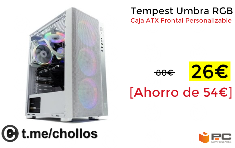 ✨Precio chollo desde Pccomponentes para esta caja Tempest Umbra con frontal personalizable, caja compatible con formatos de placa base ATX, Micro-ATX e ITX, incluye 4 ventiladores ARGB y lateral de cristal templado. Gastos de envío de 6,9€.