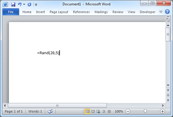 Microsoft Word dasturida foydalanuvchilarga qulaylik yaratish maqsadida shunday imkoniyat ham ko‘zda tutilgan. Bu uchun dasturni ishga tushirib, matn kiritish qismiga: =rand(1,1) ni kiritib, Enter tugmasini bosing. Siz ishlatayotgan dasturning qaysi tildagi versiyasi o‘rnatilganligiga qarab yo rus yo ingliz tilida quyidagicha tayyor matn paydo bo‘ladi: