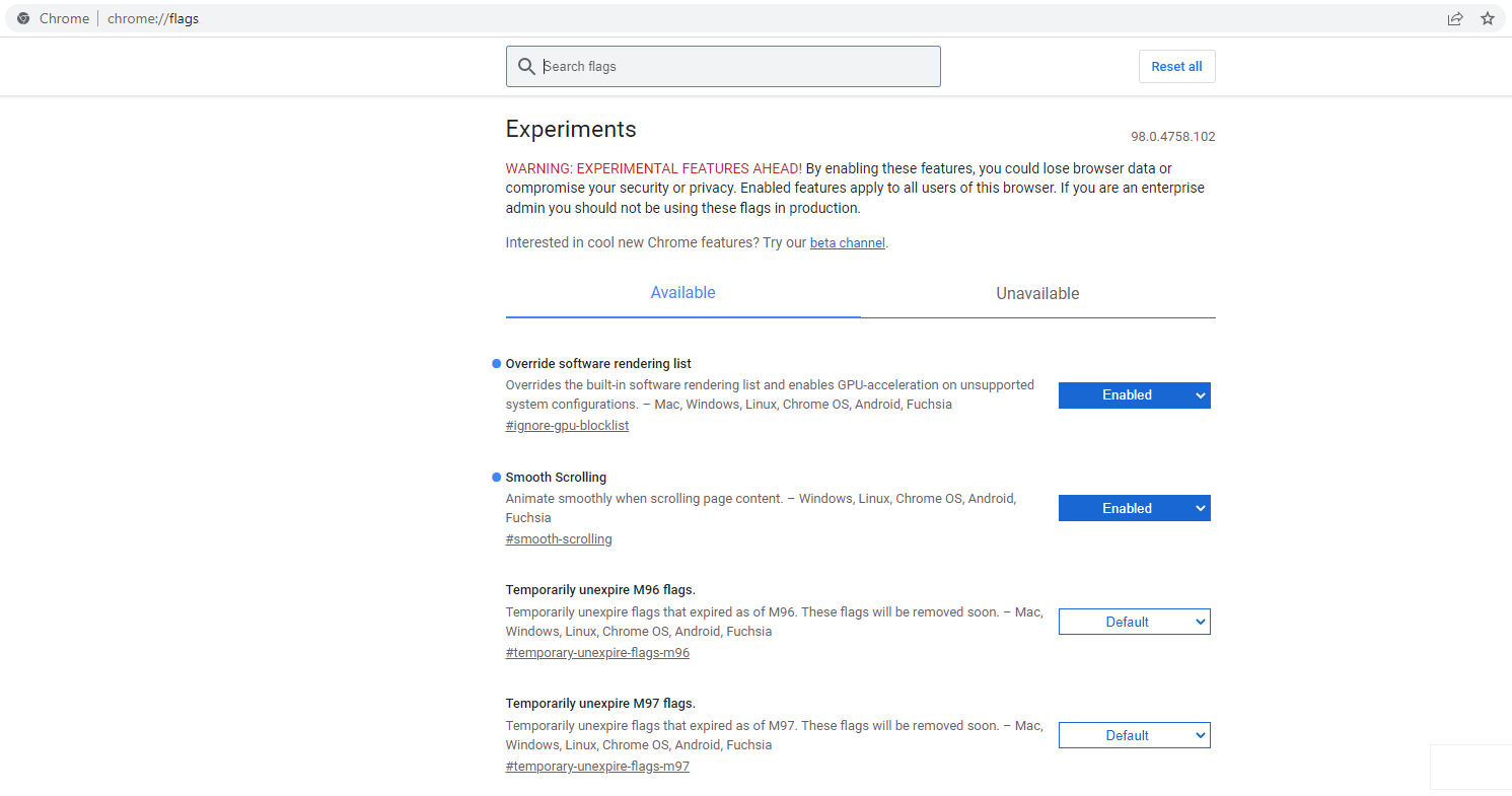 chrome://flags havolasini kiritamiz, ochilgan sahifaning qidiruv satriga #smooth-scrolling'ni kiritib izlaymiz. Ushbu sozlama uchun ro‘yxatdan Enabled'ni tanlaymiz va brauzerni qayta ishga tushiramiz. Keyingi heshteg bilan ham xuddi shunday yo‘l tutamiz.