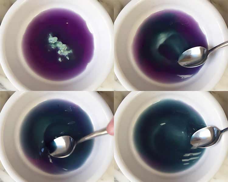 У вас должен получиться очень яркий тёмно-фиолетовый сок. Начинайте добавлять в него по одной щепотке соды, чтобы постепенно изменять рН в щелочную сторону. Делайте так, пока жидкость не станет голубой.