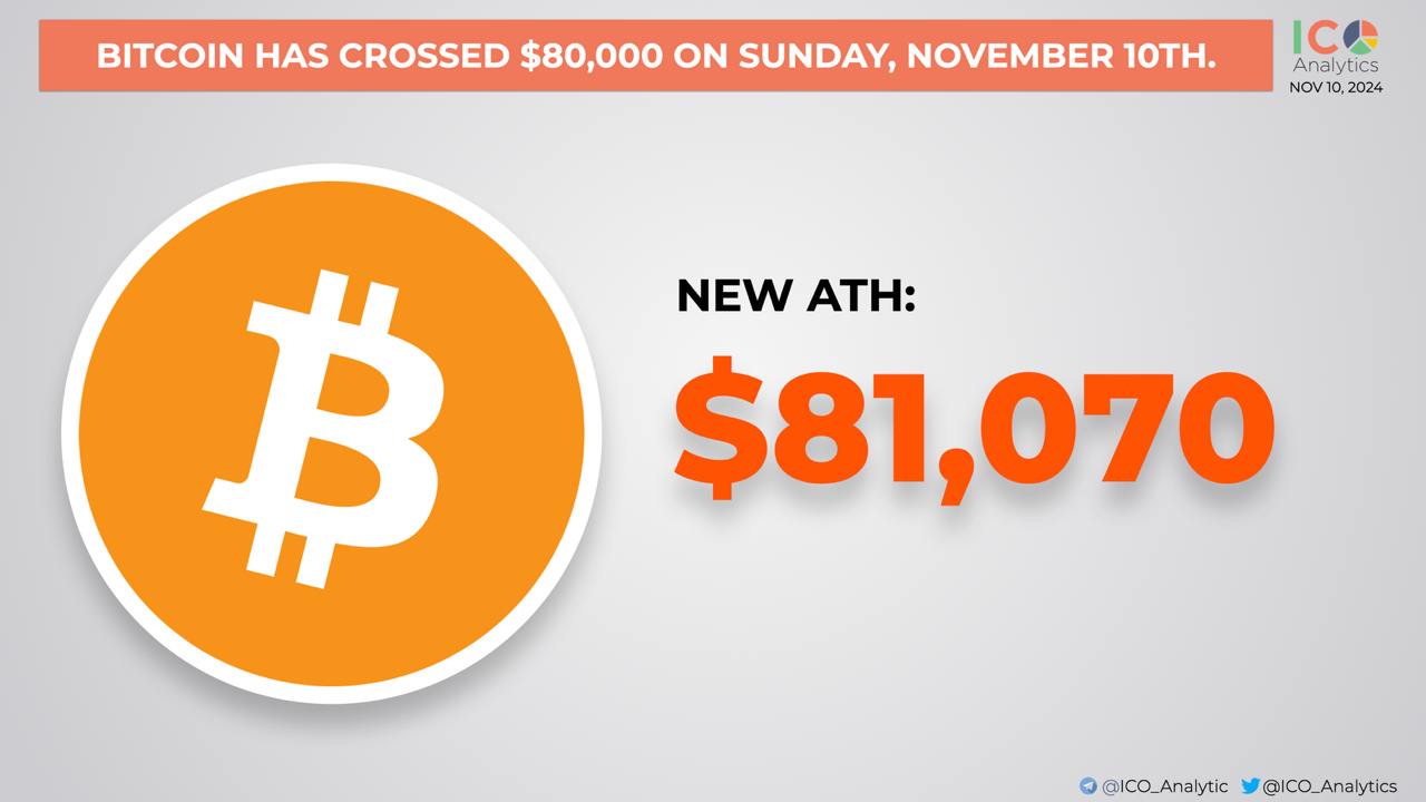 Bitcoin has crossed $80,000 on Sunday, November 10th. BTC price is 4.5% up during last 24h and +17% during last 7 days.