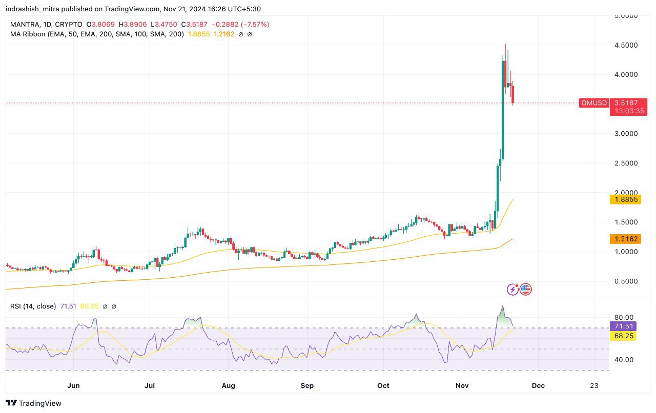 One of the latest tokens in the current bull run - Mantra token has seen a significant price in its price, nearly tripling in value from under $1.5 to nearly $4.5 at the recent highs. OM price has corrected slightly since then, but the overall sentiment and technical structures still remain strongly bullish. OM is trading far above both the 50-day and 200-day EMAs and is in totally uncharted territory, having created a new ATH. While the uptrend seems strong, what must be noted is that RSI for this altcoin is in overbought situation, having recently touched 80+ levels - thus one needs to take care before attempting to enter in this volatile market. On the upside, psychological levels can potentially be areas of consolidation while, the $2.5 to $3 level on the downside should serve as a support.