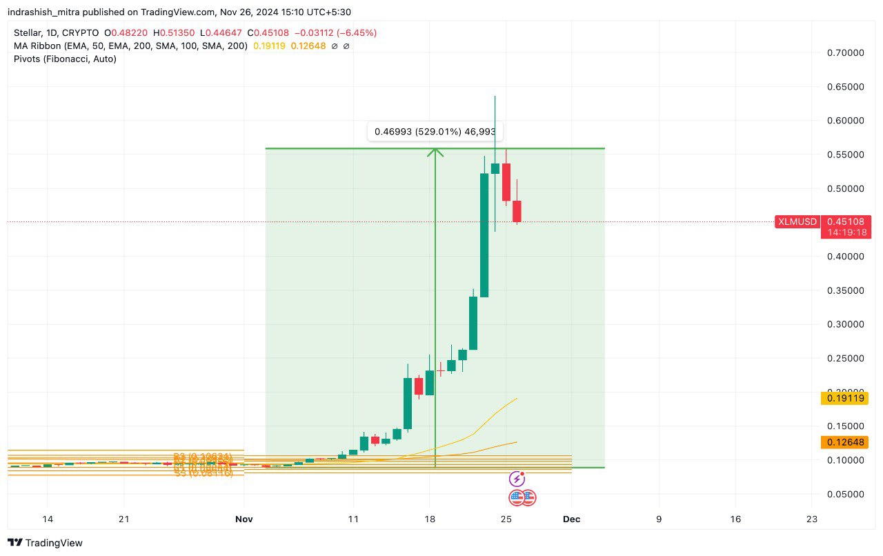 Stellar's price has experienced a remarkable surge in November, skyrocketing by over 500% since the start of the month. XLM's value climbed from well below $0.10 to nearly $0.65 at its peak before settling around $0.45 at the time of writing. Currently, the token is trading in largely uncharted territory, making traditional technical indicators less reliable for analysis. Instead, psychological levels are becoming key in identifying potential price movements. On the upside, Stellar may encounter resistance near the $0.50 level, and a breakout beyond this point could trigger increased buying pressure.
