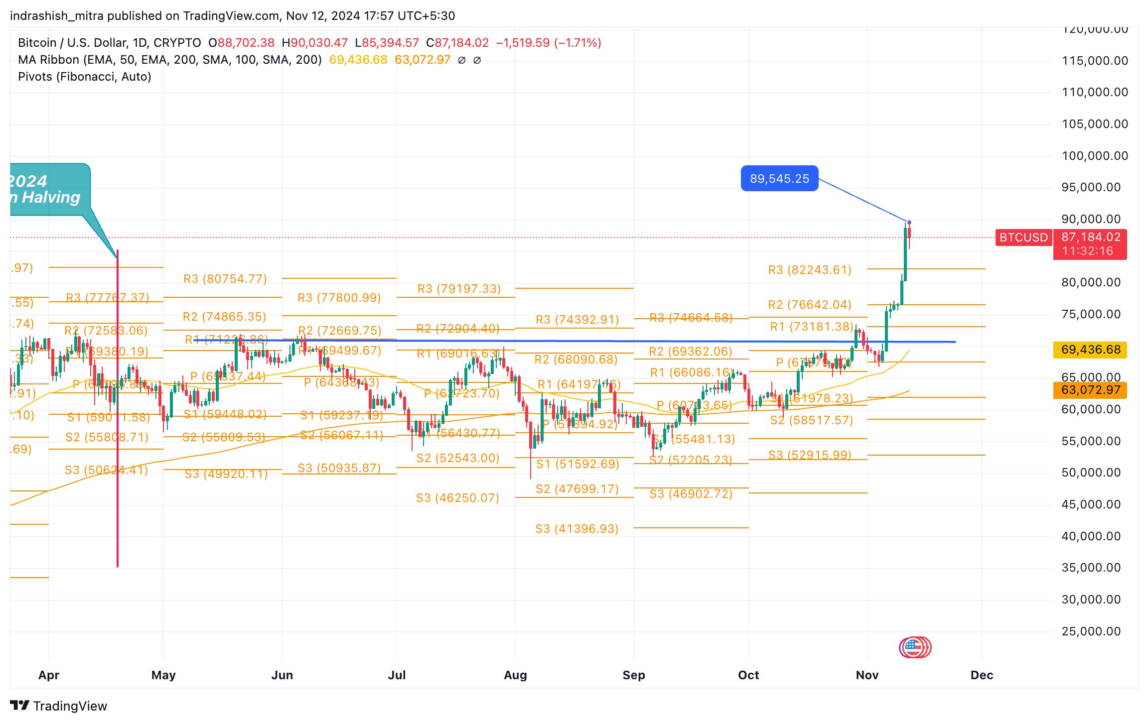 During the U.S. election vote counting, Trump’s lead over Kamala Harris propelled Bitcoin’s price above its previous all-time high of approximately $73,900, briefly reaching over $75,000. Even with the election now settled, Bitcoin price has continued its non-stop rally, touching $89,000 earlier today. This breakout ended Bitcoin’s 8-month consolidation period, with technical indicators signaling sustained bullish momentum that could drive prices higher. The Relative Strength Index is near overbought levels, supported by a Golden Cross—a bullish crossover between the 50-day and 200-day EMAs—indicating ongoing buying pressure. Historically, such price action suggests Bitcoin may be at the start of a bull run with potential to surpass $100,000 before 2024’s end.