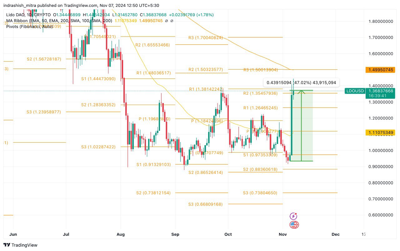 Over the past two days, the Lido DAO price has spiked nearly 50%, going from under $1 to nearly $1.4 as of this writing—with a major chunk of this spike coming yesterday. Broadly, Lido DAO price is still pretty bearish and it needs to break out of the crucial $2 level and then eventually $3.5 before it seems fresh recovery coming in to its former glory. This recent jump in LDO price, amid the positive news around Trump’s reelection to the White House and its strongly pro-crypto stance this time around is expected to play well with this altcoin.