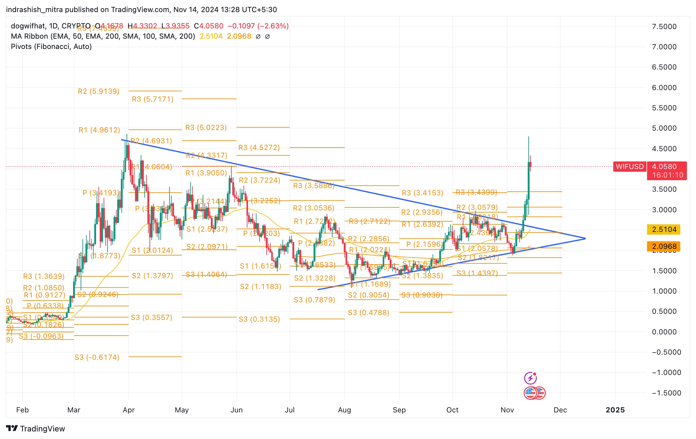 Amid the hype train around memecoins, especially Dogecoin post the Trump victory in the US Election 2024, and Elon Musk’s appointment to the Department of Governmental Efficiency (D.O.G.E) - Dogwifhat has also joined in the crypto bull market fever. WIF price has rallied over 73% over the past 7 days alone - nearly testing its previous all-time high near $5. Currently holding above the psychological level of $4 - a further rally post the momentary consolidation can result in a fresh new all-time high above $5 potentially before the end of November 2024. WIF price is trading well above both the 50-day and 200-day EMAs - both of which are in a golden crossover, further giving weight to the bullish view. WIF price has also broken out of the symmetrical triangle chart pattern (marked in blue).
