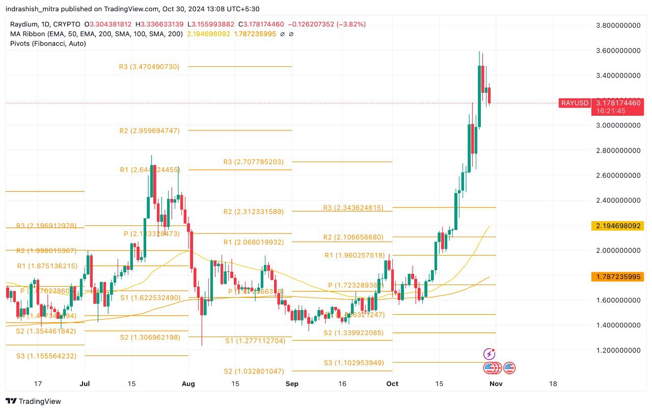 Raydium has been on a strong upward trajectory ever since the beginning of “Uptober” - smashing thorough all the levels of Fibonacci resistance levels. This massive rally has resulted in the token touching new all-time highs, trading in near uncharted territory over the past few days. If this trend continues, we could see Raydium price potentially testing the crucial psychological level at $5 by the middle of November and possibly even $10 before the end of 2024. Further, Raydium also has a bullish golden crossover of the 50-day and 200-day EMAs to support further upward moves. On the downside, Raydium price can be expected to find support near the $2 to $2.5 region, which coincides with the 50-day EMA and the R3 Fibonacci level for October.