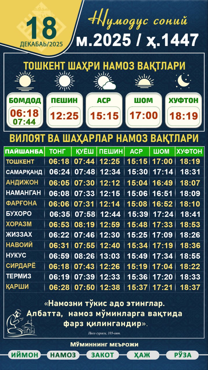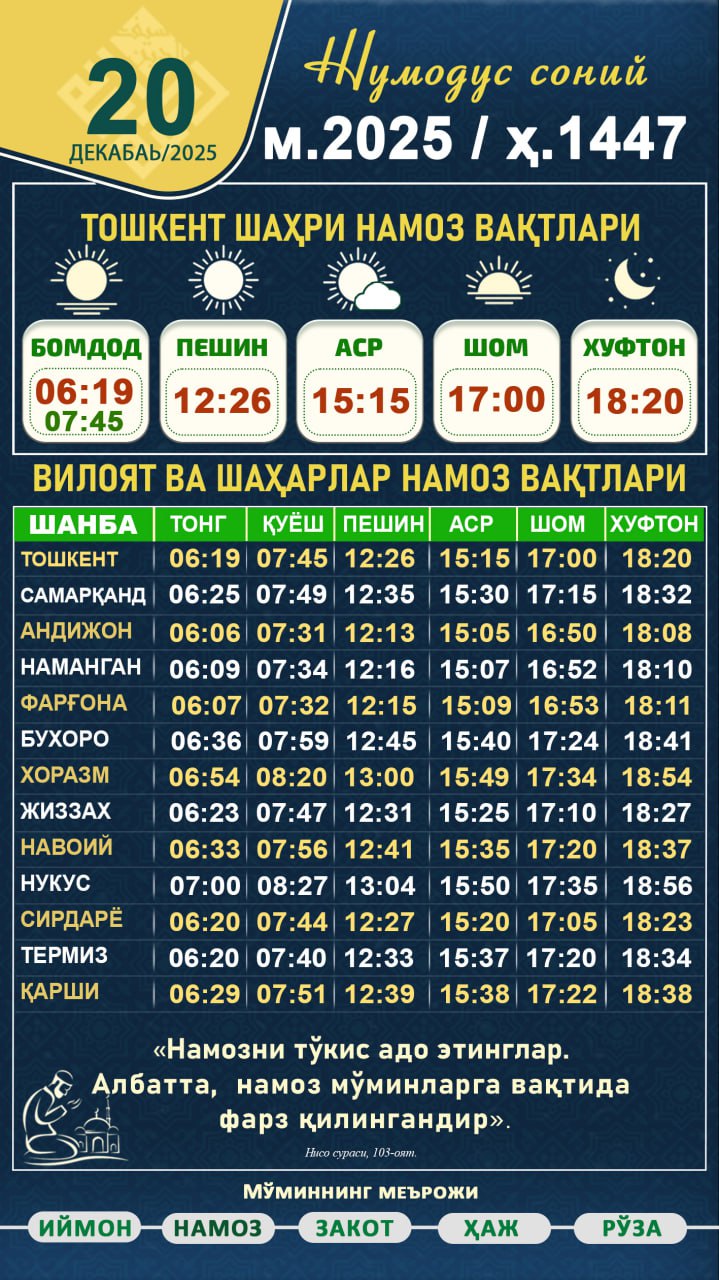 ⏰ БУ КАНАЛДА, КУНЛИК НАМОЗ ВАҚТЛАРИ БЕРИБ БОРИЛАДИ. «Намозни тукис адо этинглар. Албатта, намоз муминларга вактида фарз килингандир» (Нисо: 103) Admin: