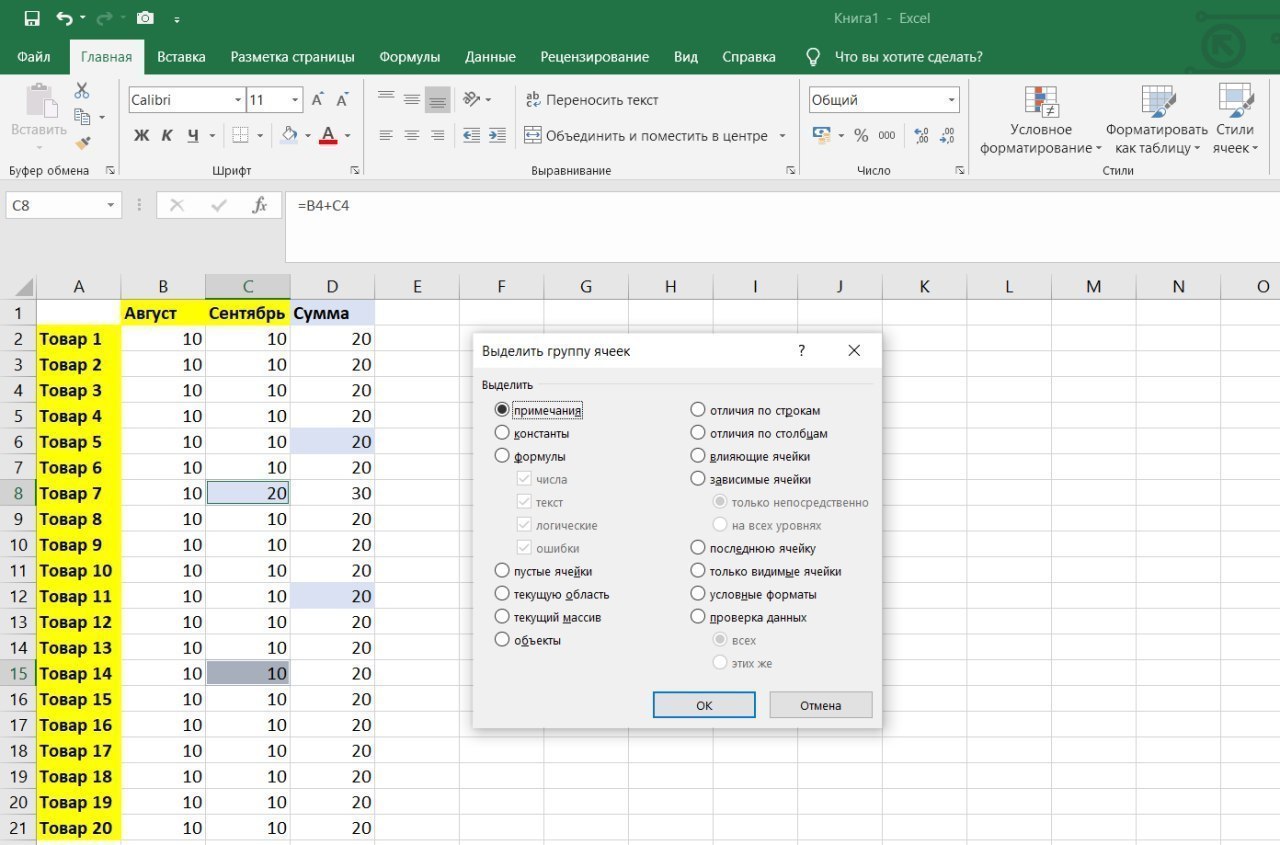 Bunday yacheykalarni tezkor aniqlash uchun butun diapazonni belgilang, Главная → Найти и выделить ketma-ketligi bo‘ylab o‘ting va Выделить группу ячеек vositasidan foydalaning. Bu uchun