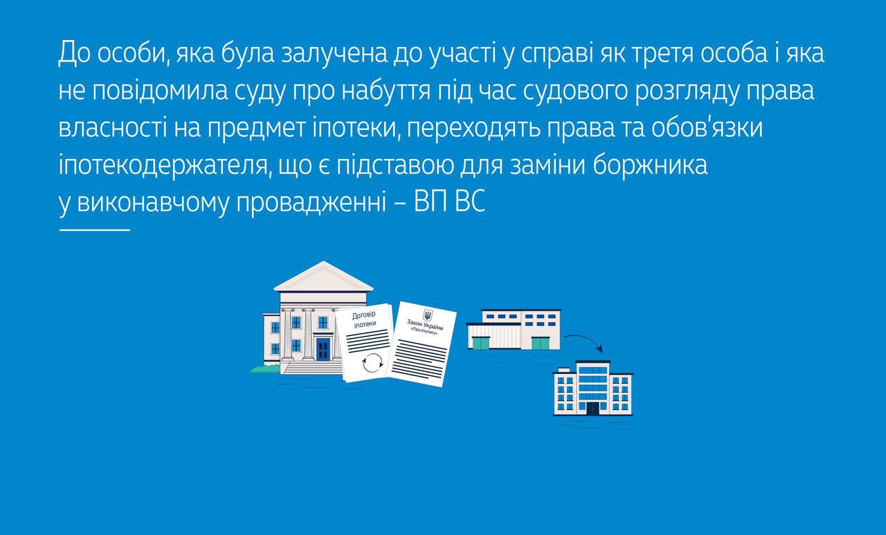 🔹ВП ВС: до особи, яка була залучена до участі у справі як третя особа і яка не повідомила суду про набуття під час судового розгляду права власності на предмет іпотеки, переходять права та обов’язки іпотекодержателя, що є підставою для заміни боржника у виконавчому провадженні