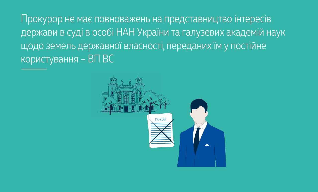 Прокурор має повноваження на представництво інтересів держави в суді в особі Національної академії наук України та галузевих академій наук щодо об’єктів права державної власності, що належать до сфери їхнього управління, за винятком, зокрема, спорів щодо земель державної власності, які передані їм у постійне користування.