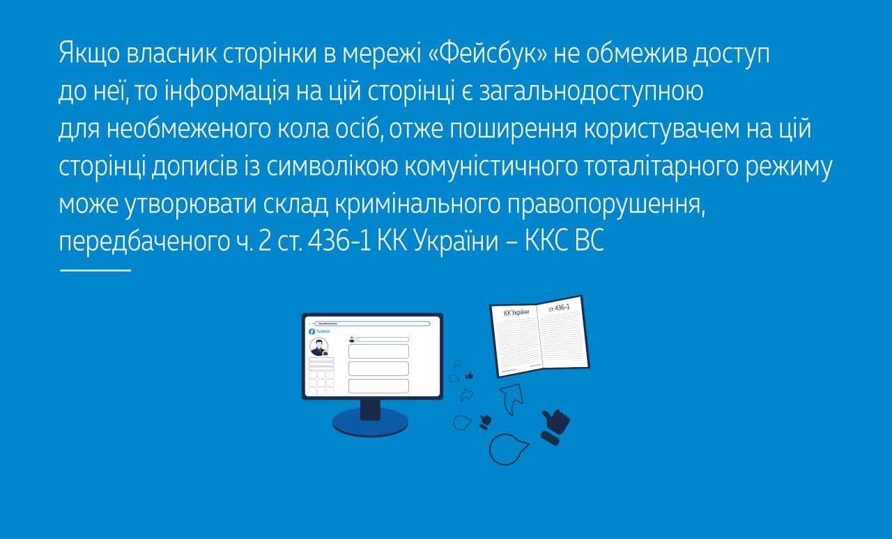 Якщо власник сторінки в мережі «Фейсбук» не обмежив доступ до неї, то інформація на цій сторінці є загальнодоступною для необмеженого кола осіб, отже поширення користувачем на цій сторінці дописів із символікою комуністичного тоталітарного режиму може утворювати склад кримінального правопорушення, передбаченого ч. 2 ст. 436-1 КК України – ККС ВС
