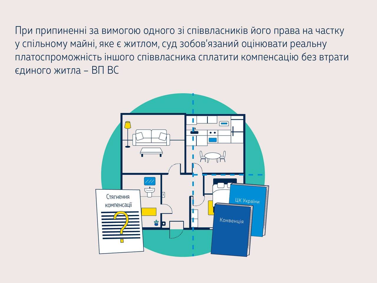 При припиненні за вимогою одного зі співвласників його права на частку у спільному майні, яке є житлом, суд зобов’язаний оцінювати реальну платоспроможність іншого співвласника сплатити компенсацію без втрати єдиного житла – ВП ВС