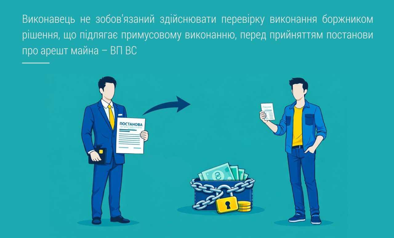 Виконавець не зобов’язаний здійснювати перевірку виконання боржником рішення, що підлягає примусовому виконанню, перед прийняттям постанови про арешт майна – ВП ВС