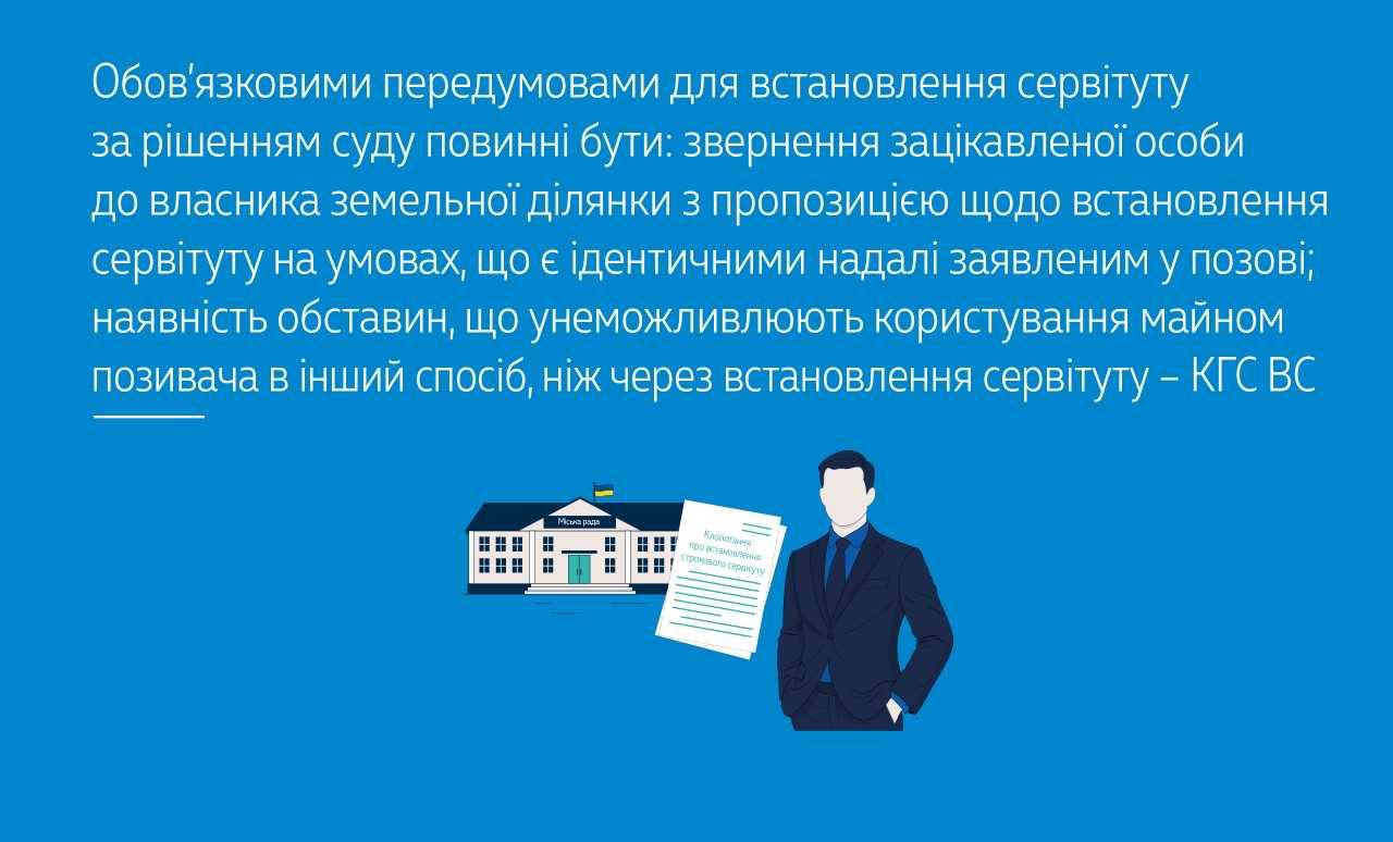 Обов’язковими передумовами для встановлення сервітуту за рішенням суду повинні бути: звернення зацікавленої особи до власника земельної ділянки з пропозицією щодо встановлення сервітуту на умовах, що є ідентичними надалі заявленим у позові; наявність обставин, що унеможливлюють користування майном позивача в інший спосіб, ніж через встановлення сервітуту – КГС ВС