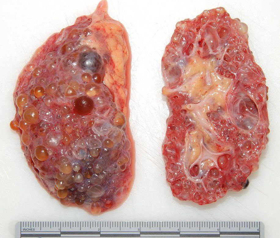 Поликистоз почек – порок эмбрионального развития почечных канальцев, характеризующийся образованием множественных кист в паренхиме почек и снижением функции почек. Кисты могут иметь размер от спичечной головки до крупной вишни и больше, содержать светлый либо шоколадного цвета желеобразный секрет.