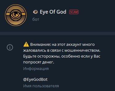Бот @EyeGodBot получил отметку SCAM, а все остальные, о которых писал выше ⬆️, перестали работать. А все почему? Потому что ребятки из Eye Of God не захотели создавать честный и качественный продукт, каким они могли бы стать. Вместо этого они пошли по простому пути и манипулируя доверием пользователей, путем обмана и недостаточного информирования простых и неискушенных пользователей, понимая что огромное количество людей нуждается в деньгах, пообещав легкий заработок, мошенническим путем, эксплуатируя невнимательность и недостаточные знания, завладели личными данными огромного количества пользователей. Но, неожиданно (для Eye Of God) выяснилось, что далеко не все пользователи так наивны, как рассчитывали Eye Of God и сознательные граждане поднасыпали им репортов.