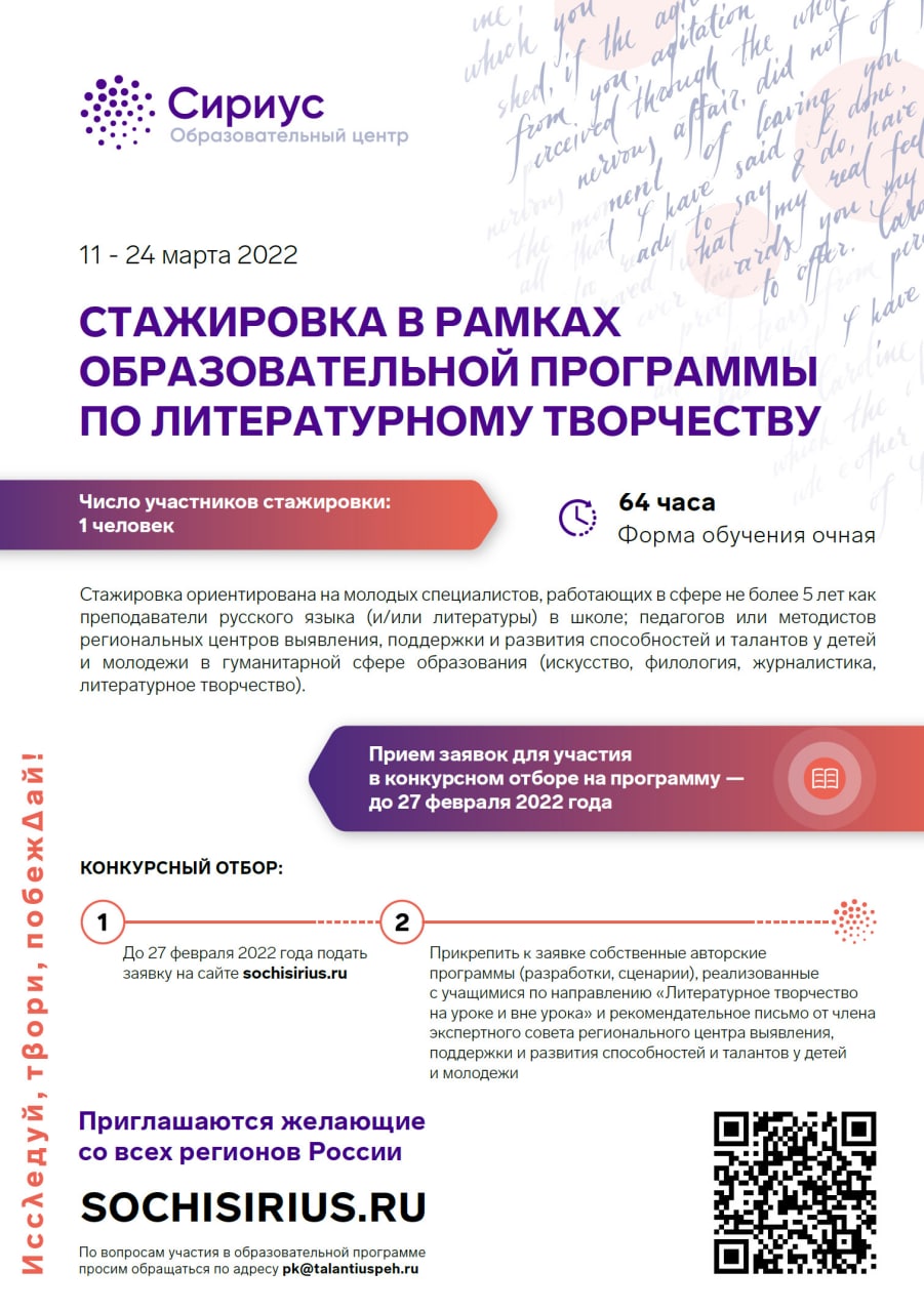 В рамках мартовской программы по литературному творчеству 11–24 марта 2022 года в Образовательном центре «Сириус» пройдет стажировка для учителей.