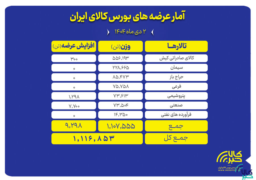 تالارهای بورس کالای ایران امروز سهشنبه ۲ دی ماه میزبان عرضه یک میلیون و ۱۱۶ هزار و ۸۵۳ تن انواع محصول است.