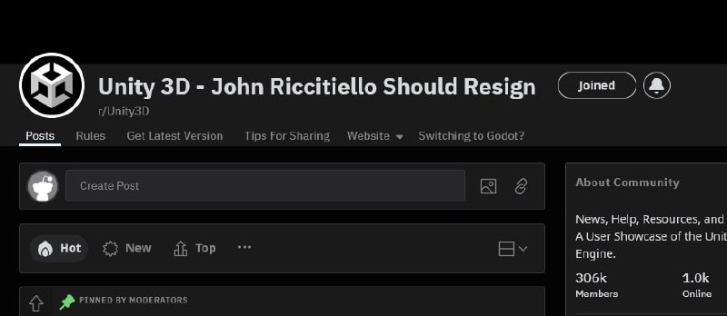 Коммьюнити в полном шоке, и я вместе с ними. На главной странице сабреддита r/Unity3D выставлено требование об отставке Риччитьелло, снизу — гайд по переходу на Godot. Многие контент-мейкеры пишут треды с критикой всех последних действий Unity, некоторые начали донатить Godot и пообещали делать ассеты, совместимые с движком.