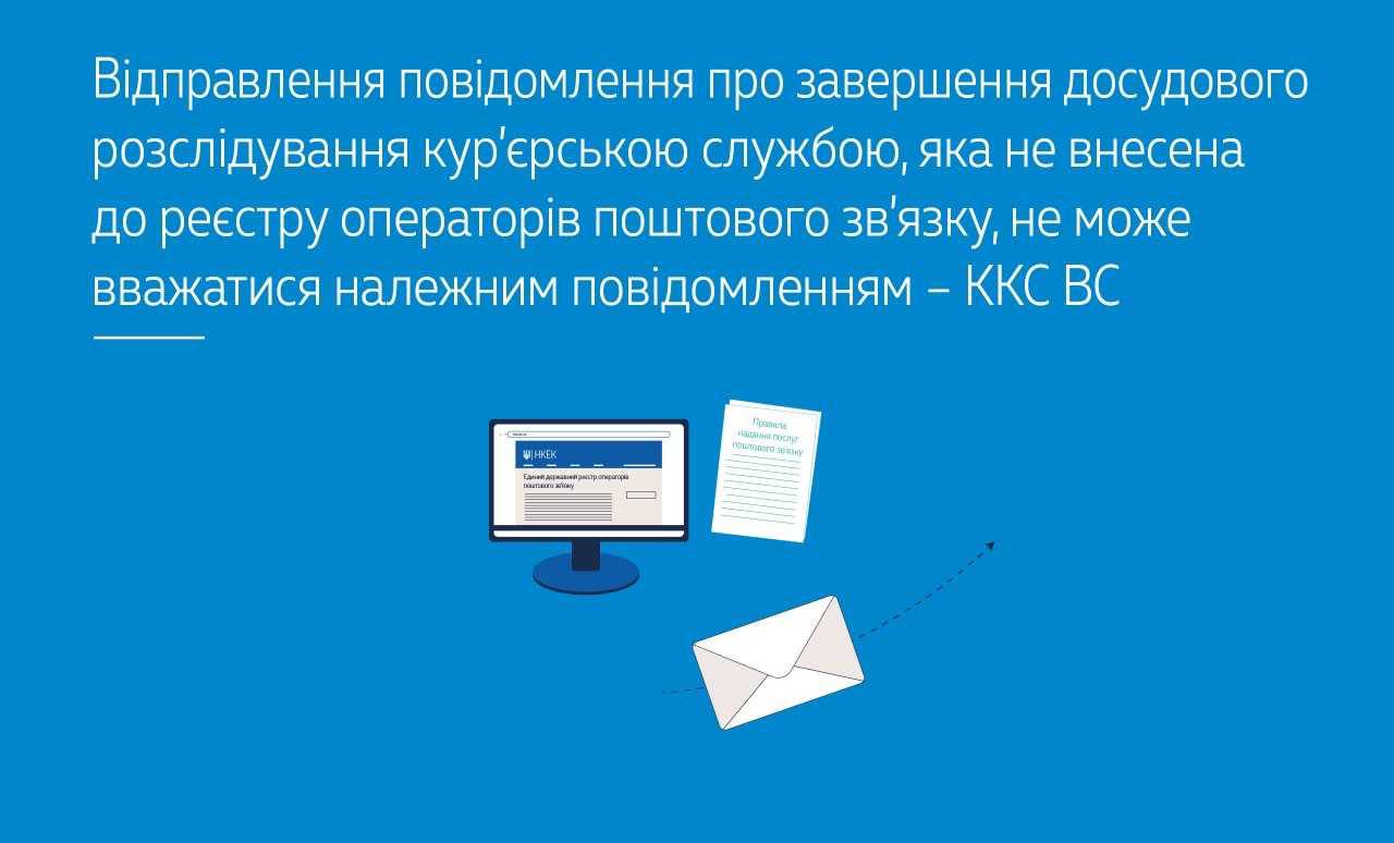 🔹ККС ВС: відправлення повідомлення про завершення досудового розслідування кур’єрською службою, яка не внесена до реєстру операторів поштового зв’язку, не може вважатися належним повідомленням