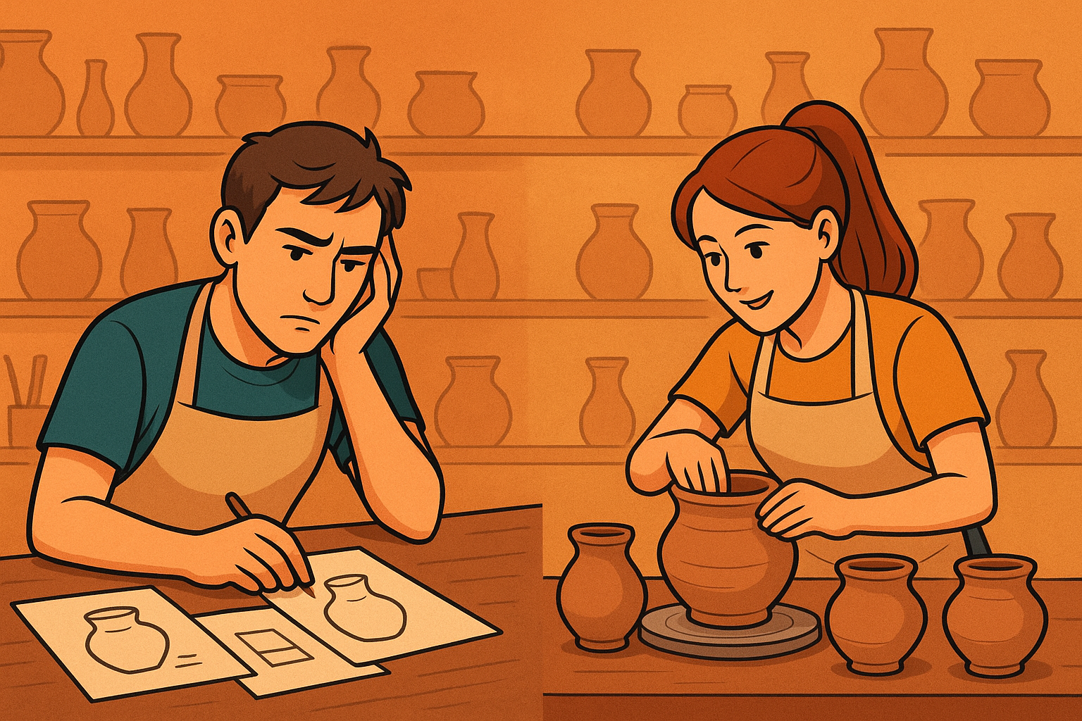 Оказалось, что горшки у первой группы получились гораздо лучше, чем у второй. Пока во второй группе люди думали, как сделать горшок получше, в первой волей-неволей приходилось учиться в процессе, учитывать ошибки, корректировать навык от горшка к горшку. А желание вылепить горшков побольше, чем у соседа, еще и не давало расслабиться, заставляло учиться быстрее.